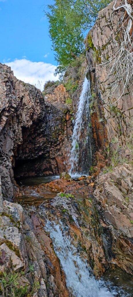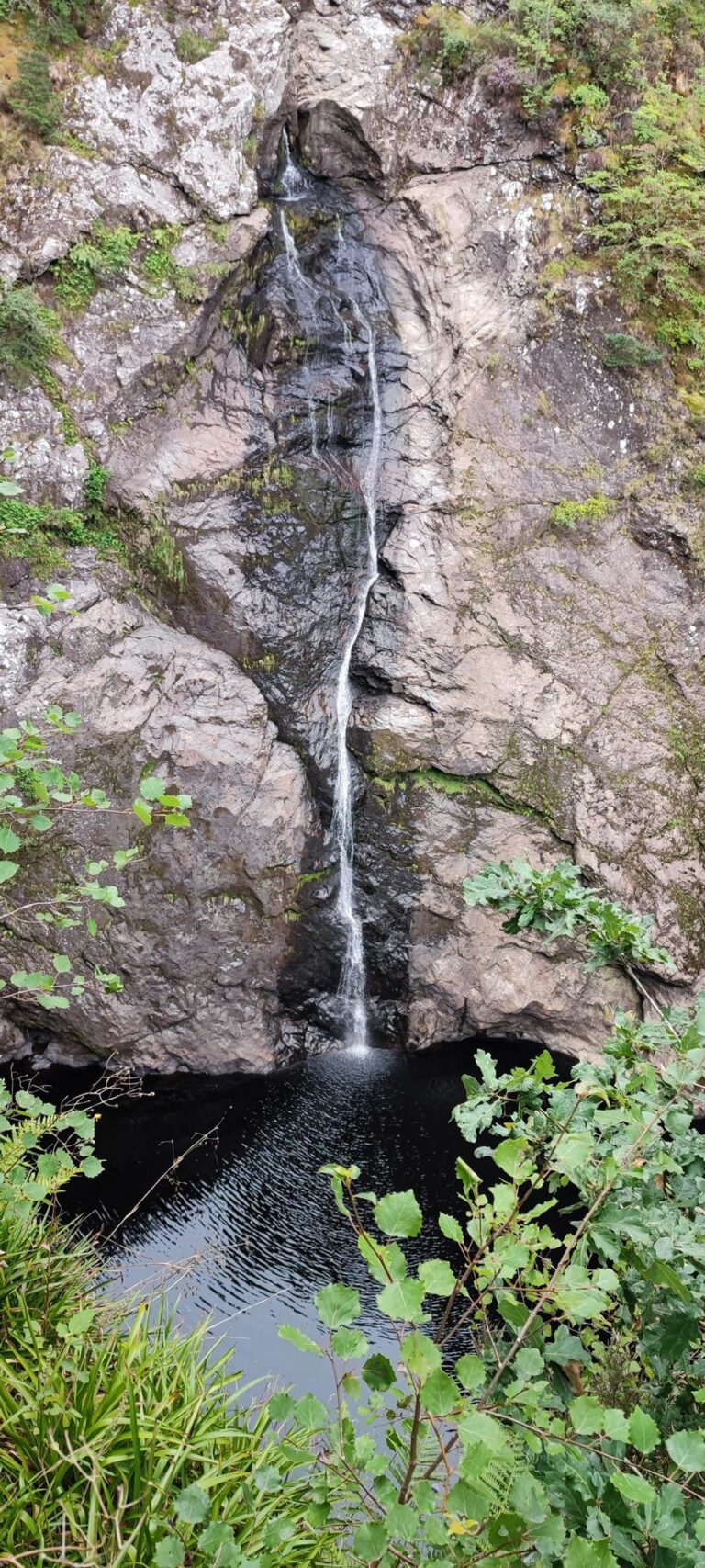 Vom kleinen Parkplatz aus (längere Fahrzeuge werden hier Probleme mit der Bodenfreiheit haben) geht man wenige Schritte zu dem Wasserfall. Dieser war mehr ein Rinnsal als ein Wasserfall. Der ganze Regen, welchen wir auf der Westseite hatten, ist hier nicht angekommen. Eine gute Möglichkeit sich die Beine zu vertreten und den Hunden etwas Bewegung zu verschaffen.