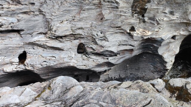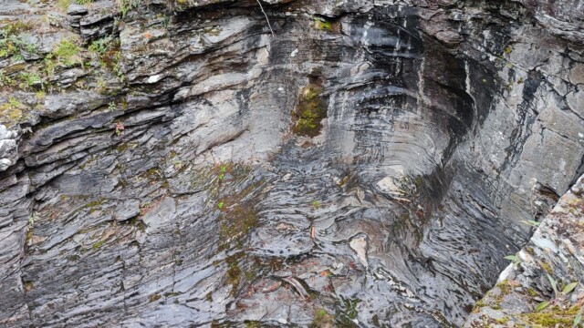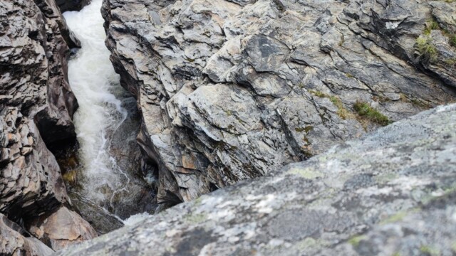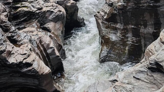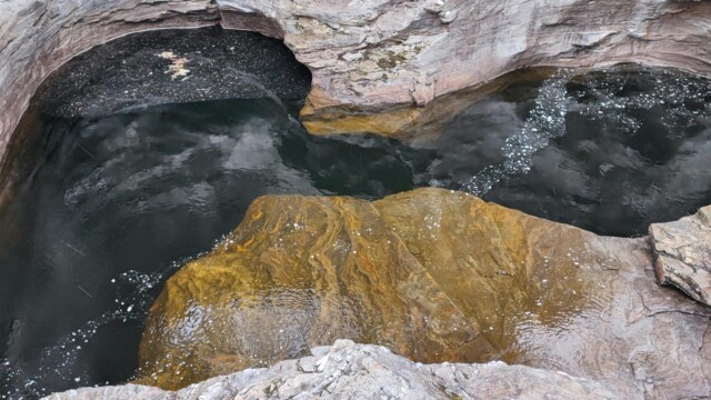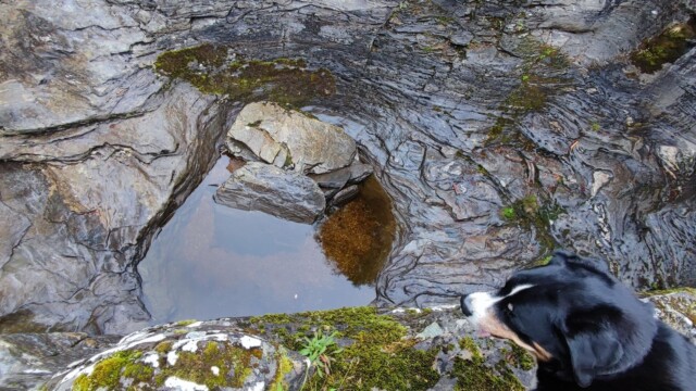 Vom kleinen Parkplatz aus (längere Fahrzeuge werden hier Probleme mit der Bodenfreiheit haben) geht man wenige Schritte zu dem Wasserfall. Dieser war mehr ein Rinnsal als ein Wasserfall. Der ganze Regen, welchen wir auf der Westseite hatten, ist hier nicht angekommen. Eine gute Möglichkeit sich die Beine zu vertreten und den Hunden etwas Bewegung zu verschaffen.