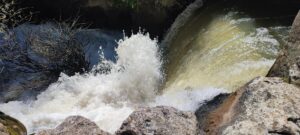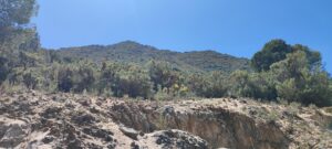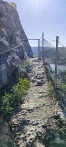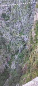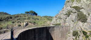 Die Planungen zum Staudamm begannen bereits 1917, das Projekt wurde dann 1947 aufgegeben, weil  durch das poröse Felsmaterial das Wasser nicht zu halten war. Heute kann man über einen schmalen Weg zur Staumauer gehen. Es ist dort auch ein Kletterpark eingerichtet. Am schönsten gefiel uns da die Landschaft und die über unseren Köpfen kreisenden Gänsegeier.